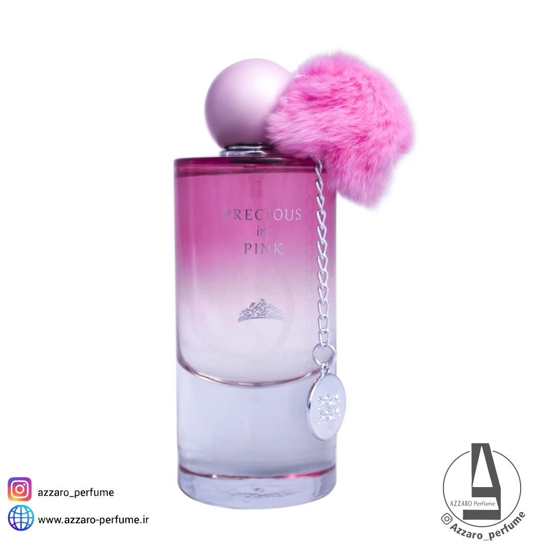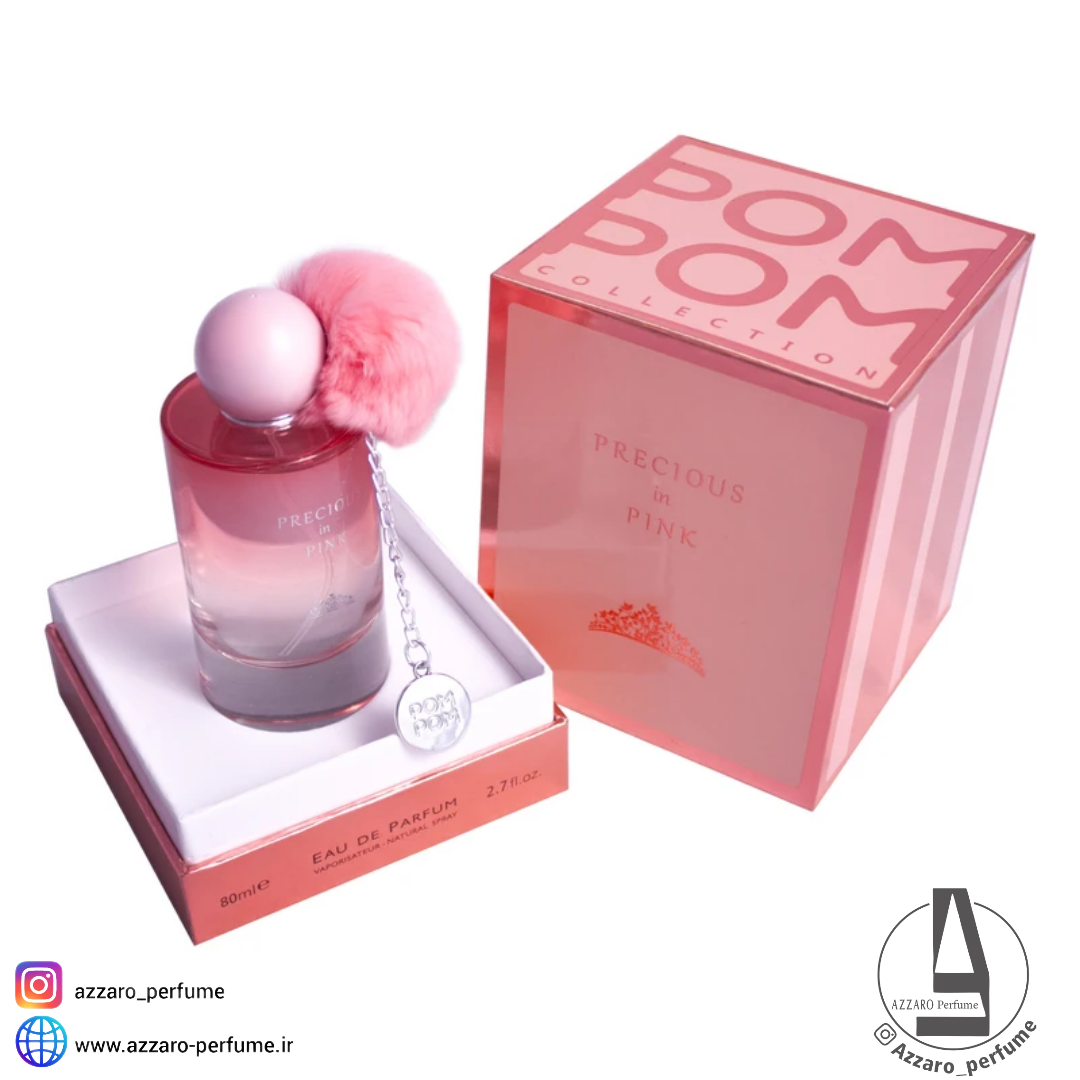 ادو پرفیوم زنانه پوم پوم مدل Precious In Pink حجم 80 میل در سال 2018 به بازار عرضه شد. رایحه ملایم و چوبی این ادو پرفیوم مناسب برای استفاده بانوان جوان در مراسم های رسمی و در تمام فصلها می باشد. برند پوم پوم ادوپرفیوم های خود را در ۶ رایحه و رنگ متفاوت به بازار عرضه کرده است. طراحی بکار رفته در این عطر بسیار جذاب و مناسب برای هدیه دادن میباشد. بطری Precious In Pink بسیار مدرن بوده و به خوبی در دست قرار میگیرد. درپوش صورتی رنگ آن دارای یک گوی زیبا از جنس الیاف بسیار نرم و لطیف است که آن را همراهی میکند. با اولین اسپری از این عطر بر روی نبض یا لباستان رایحهی ترنج و مرکبات به عنوان نت اولیه شنیده میشود. با گذشت زمان رایحههای یلانگ یلانگ، یاس، پونه کوهی، اقاقیا و نتهای گلی به عنوان نت های میانی رخ مینماید. پس از آن رایحه نت های چوبی، چوب صندل، مشک و سدر به عنوان نت های پایانی مشام شما را پر خواهد کرد. ادو پرفیوم زنانه پوم پوم ماندگاری نسبتا طولانی داشته و رد بویی جذاب از خود بر جای میگذارد.