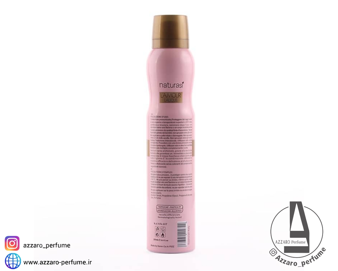 اسپری بدن زنانه ناتوراسی رایحه لالیک لامور Lamour Lalique حجم 200 میل رایحه خنک و شیرین گلی مناسب برای بانوان مناسب فصول گرم ماندگاری 24 ساعت مورد استفاده برای قرارهای رسمی، مهمانی ها، روزمره نت اولیه : ترنج ، بهار نارنج، رز نت میانی : یاس، گاردنیای یاسمنی، گل مریم نت پایه : مشک ، سدر ، چوب صندل سفید حجم: 200 میلی لیتر